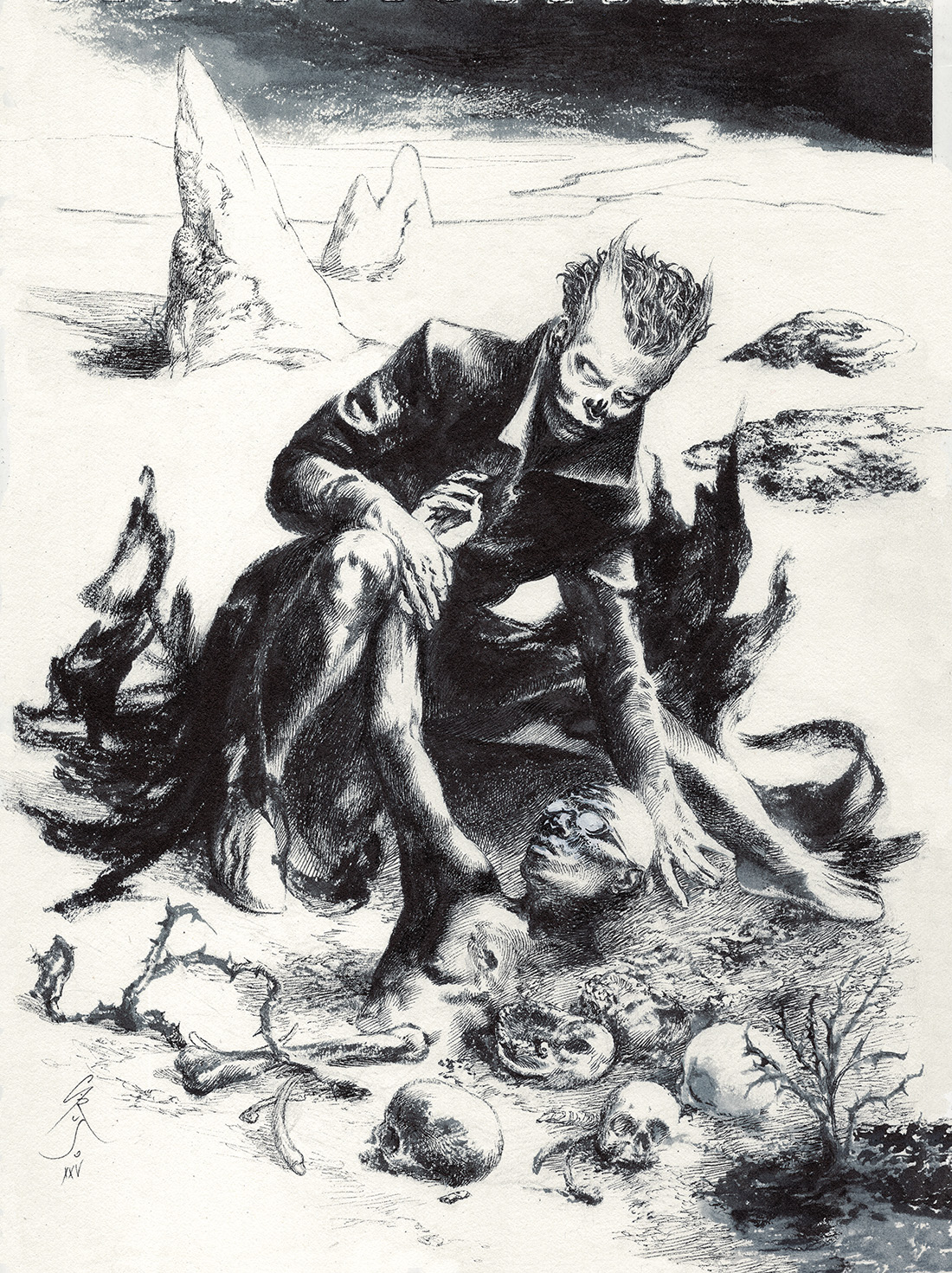 Ink & Scratch over prepared cardboard | 21 x 28 cm | 2021 | SOLD Colored version made on PS. Created for Grinding Gear Games. -